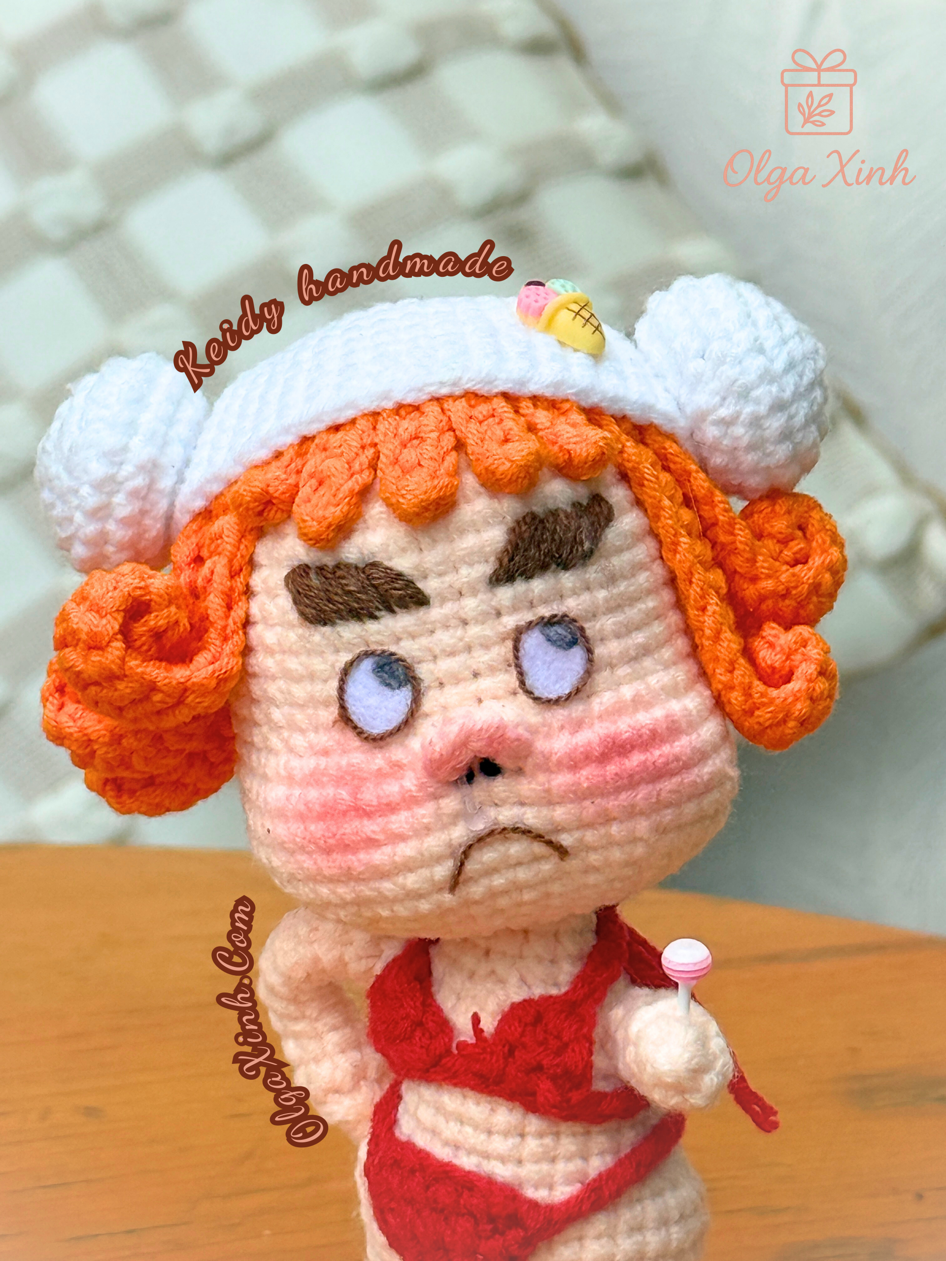 Búp bê len handmade tạo hình cô nàng mặc bikini đỏ quyến rũ, mái tóc xoăn cam nổi bật và gương mặt cá tính với lông mày đậm.